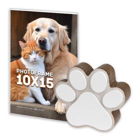 De ZX9946 van Zep Italia is een fotolijst welke geschikt is voor foto’s van 10x15 cm. De fotolijst kenmerkt zich door het hondenpootje. De fotolijst is geschikt voor verticale plaatsing. U kunt hem op een ondergrond plaatsen.