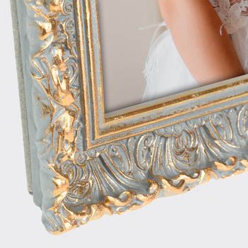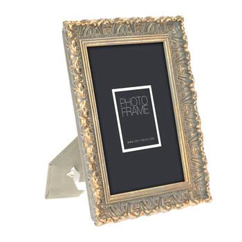 Geef je favoriete foto s een plek in stijl met de Zep Valbonne fotolijst 10x15. Deze elegante lijst van grijs- en goudkleurige hars straalt dankzij het klassieke barokke reliëf. De fluwelen achterkant en verfijnde details zorgen voor een luxueuze uitstraling die perfect past bij bijzondere momenten. Zet m op een dressoir, tafel of plank en laat herinneringen de aandacht trekken die ze verdienen.