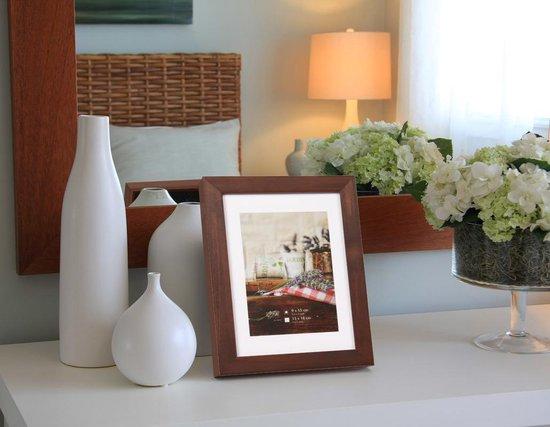 De Henzo Jardin fotolijst 40 x 50 centimeter donkerbruin is gemaakt om aan de muur te worden gehangen en kan ook ergens worden neergezet. Met haakjes kan de lijst horizontaal of verticaal aan de muur komen te hangen. Je opent de lijst door de clips los te maken die aan de achterkant zitten. Met de aanwezige passe-partout past er dan een foto van 30 bij 40 centimeter in de Henzo Jardin fotolijst 40 x 50 centimeter donkerbruin. Als deze passe-partout van zuurvrij karton verwijderd wordt uit de lijst dan kan de afbeelding of foto een formaat hebben van maximaal 40 bij 50 centimeter.