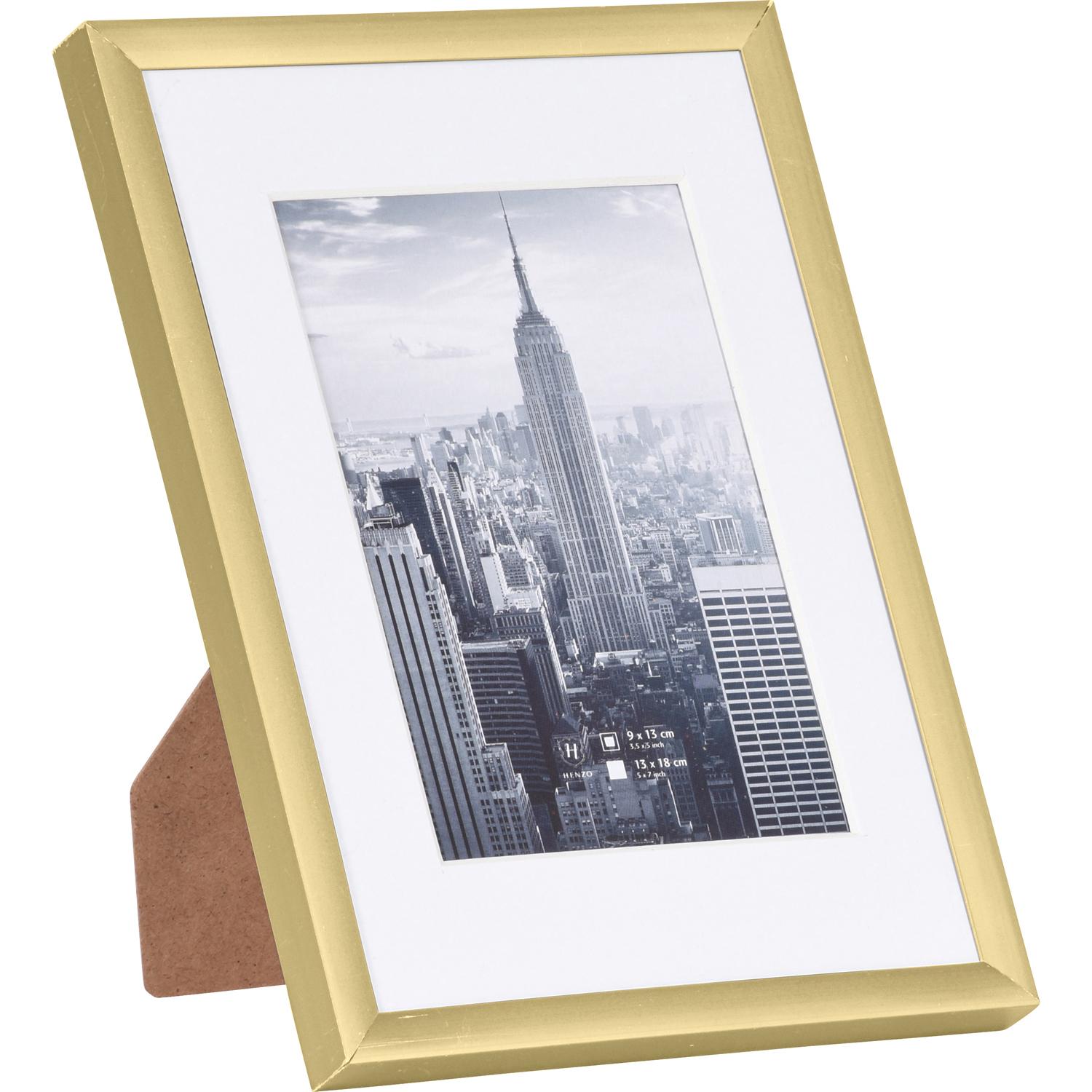 De Henzo Manhattan fotolijst 13 x 18 centimeter goud is een smalle en moderne fotolijst met een strakke uitstraling. Dat komt mede door de rand die gemaakt is van aluminium met een gouden kleur. Deze lijst is gemaakt om neer te zetten of op te hangen. Door de achterkant los te maken en te verwijderen kun je gebruik maken van een passe-partout voor een foto met een formaat van 9 bij 13 centimeter. Maak je daar geen gebruik van dan kan de foto een afmeting hebben van maximaal 13 bij 18 centimeter. De fotolijst is aan de achterkant voorzien van een staander om de foto mee neer te kunnen zetten. Het is ook mogelijk om de Henzo Manhattan fotolijst 13 x 18 centimeter goud op te hangen.