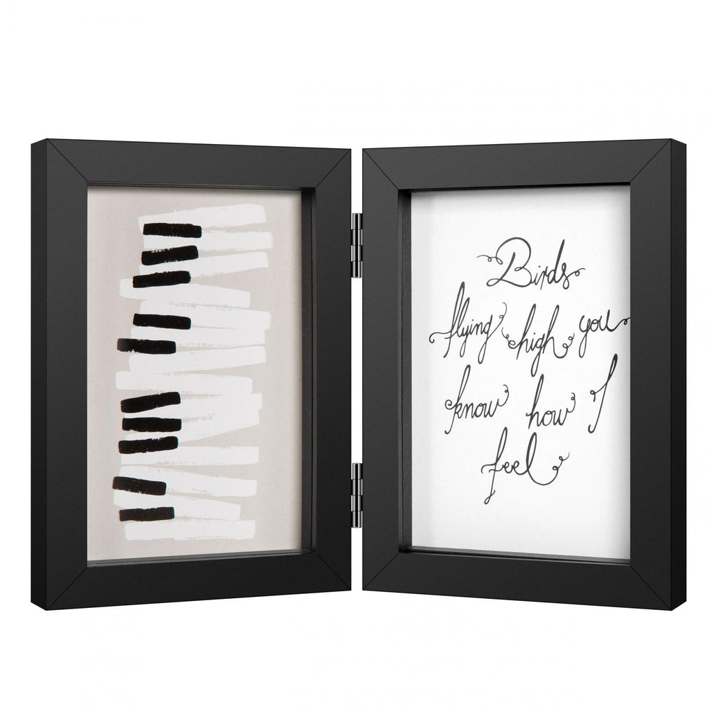 De Henzo Piano Double Swing zwart collagelijst is geschikt voor 2 foto’s van 13 x 18 cm. Er wordt geen passe-partout meegeleverd. Je kan de lijst zowel ophangen als staand neerzetten. De lijst kan in portretformaat of landschapsformaat aan de muur worden gehangen of op een kast worden gezet. De lijst zelf is gemaakt van hoogwaardig MDF en is beschikbaar in de kleuren wit naturel en zwart.