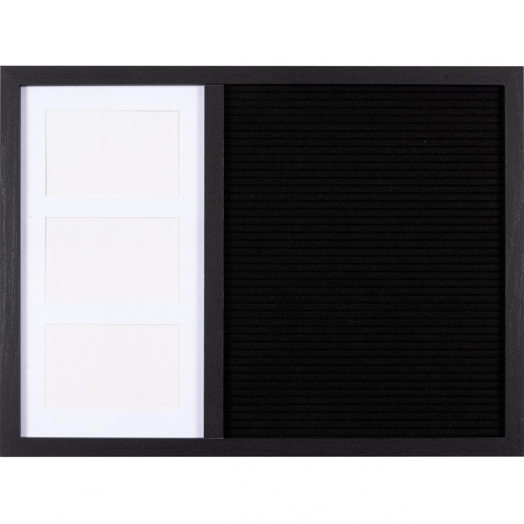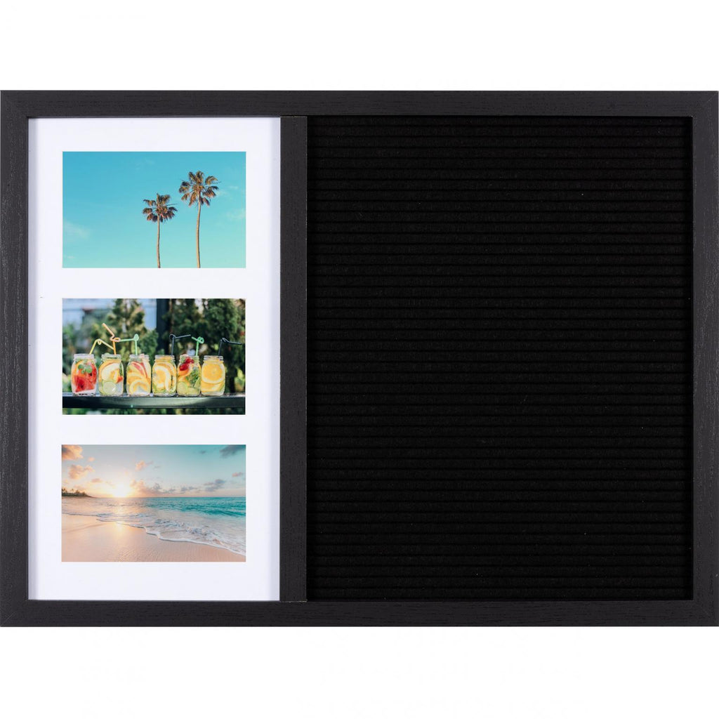Met dit Henzo letterbord met 3 foto’s zwart kunnen berichten eenvoudig en snel worden gedeeld. Behalve het bord zelf worden daartoe letters en andere hulpmiddelen geleverd die op het bord geprikt kunnen worden. Zelf schrijven knippen en plakken is daarmee verleden tijd. Op dit bord kunnen verder 3 foto’s in de meegeleverde passe-partouts worden geplaatst. Letters emoticons en diverse fotohoeken zorgen ervoor dat elke boodschap kan worden weergegeven. Het bord is van hout heeft een afmeting van 42 bij 55 centimeter en kan staand of hangend worden gebruikt. Hierdoor kunnen de 3 extra foto’s worden geplaatst in landschaps- of portretvorm. Het letterbordgedeelte neemt circa tweederde van de oppervlakte in beslag.