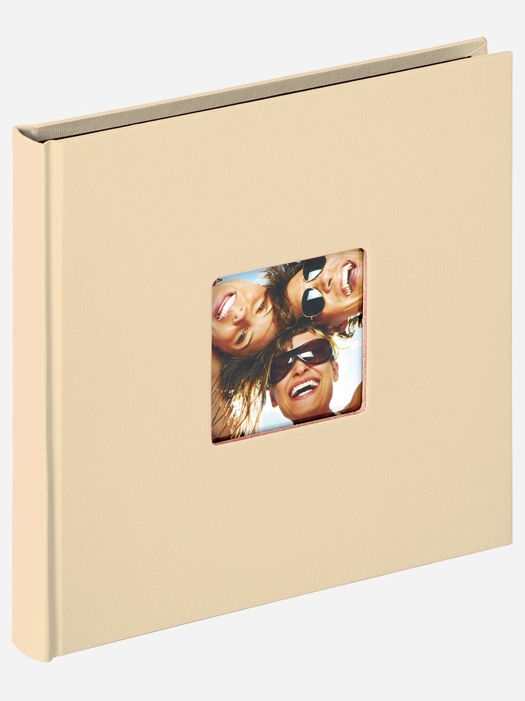 Boekgebonden fotoalbum met uitsnede voor een eigen foto in de (structuur karton) kaft.