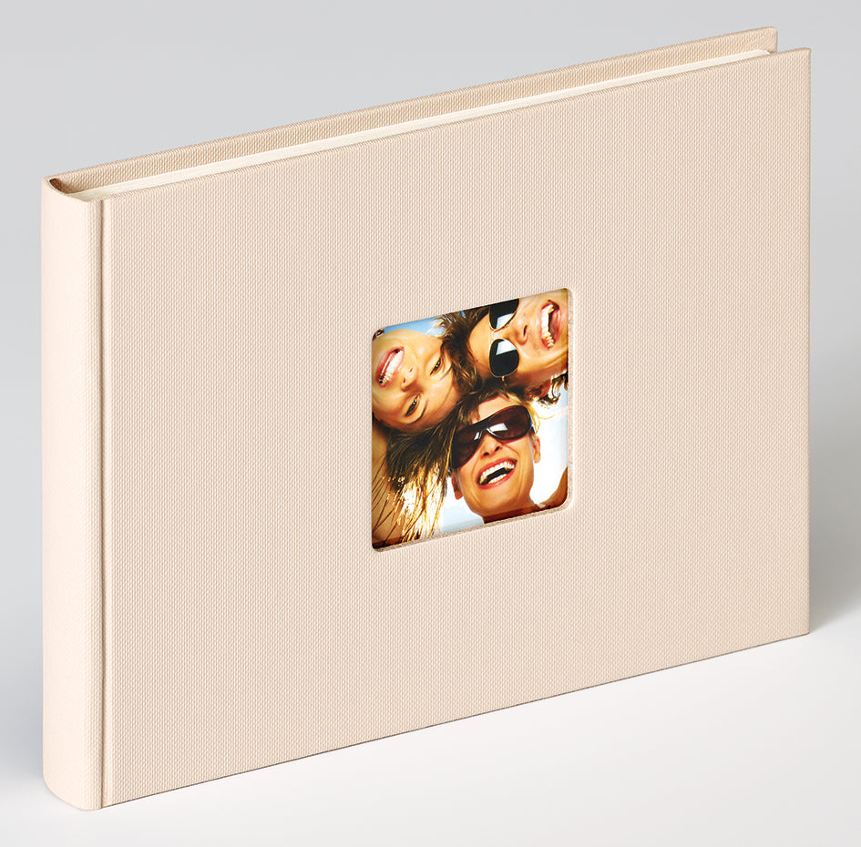 Boekgebonden fotoalbum met uitsnede voor een eigen foto in de (structuur karton) kaft.