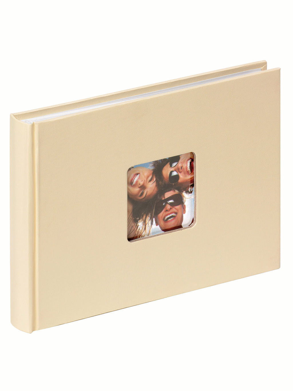 Boekgebonden fotoalbum met uitsnede voor een eigen foto in de (structuur karton) kaft.