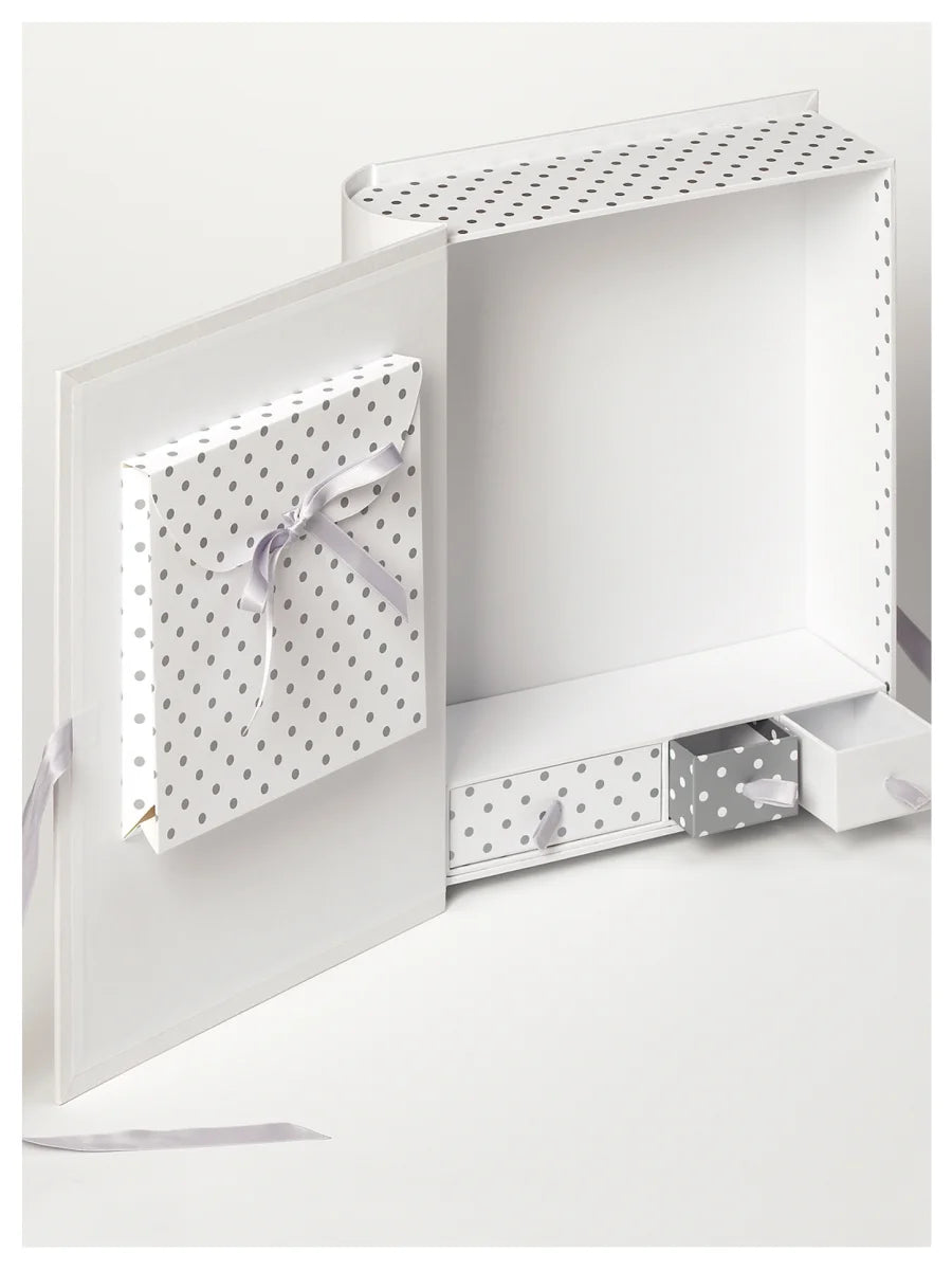 Bewaar de allereerste herinneringen van je baby veilig en stijlvol in de Little Foot opbergbox. Deze ruime box (28x34x9 cm) heeft drie kleine laadjes voor speciale spulletjes en sluit met een elegante strik. De luxe omslag is afgewerkt met zilverfolie en biedt ruimte om de naam van je kindje persoonlijk in te vullen. Een prachtig aandenken én een waardevol kraamcadeau.