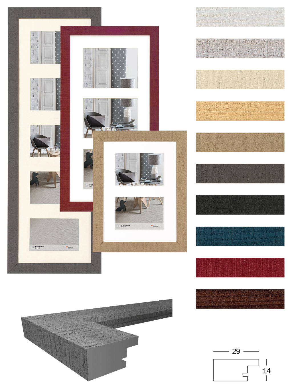 De kleuren middenbruin - petrol - naturel - bordeaux en lichtgrijs zijn in 10 verschillende formaten verkrijgbaar.