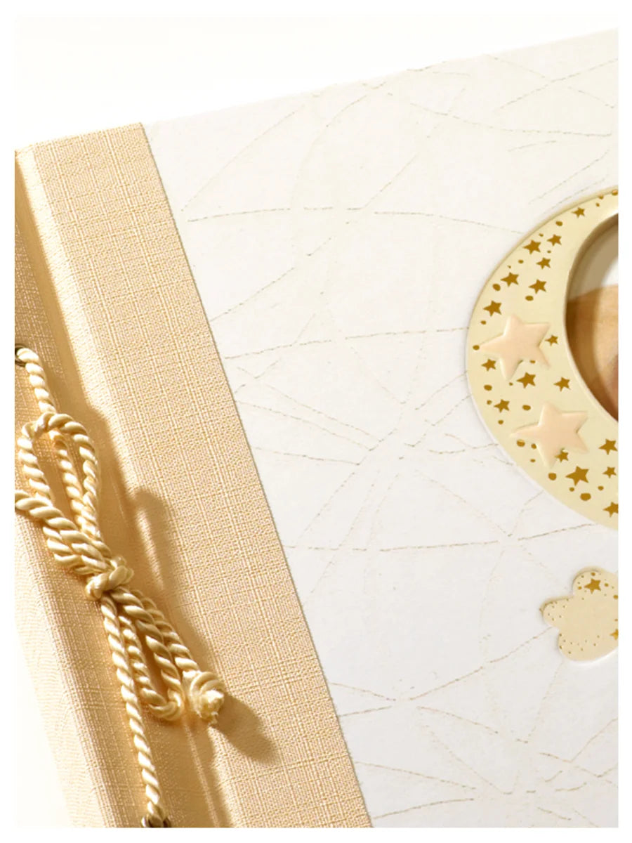 Het album is uitgevoerd met een stijlvolle koordbinding en een hoogwaardige, gelamineerde kunstdrukomslag met goudopdruk van babyfiguren, sterren en wolken.